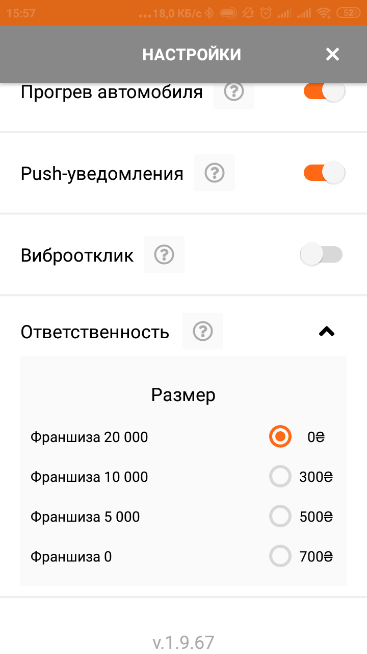 Изначально, в настройках приложения установлена франшиза размером в 20 000 грн., однако, ее можно уменьшить, тогда у тебя будет ежемесячная абонплата за сниженную / нулевую ответственность: