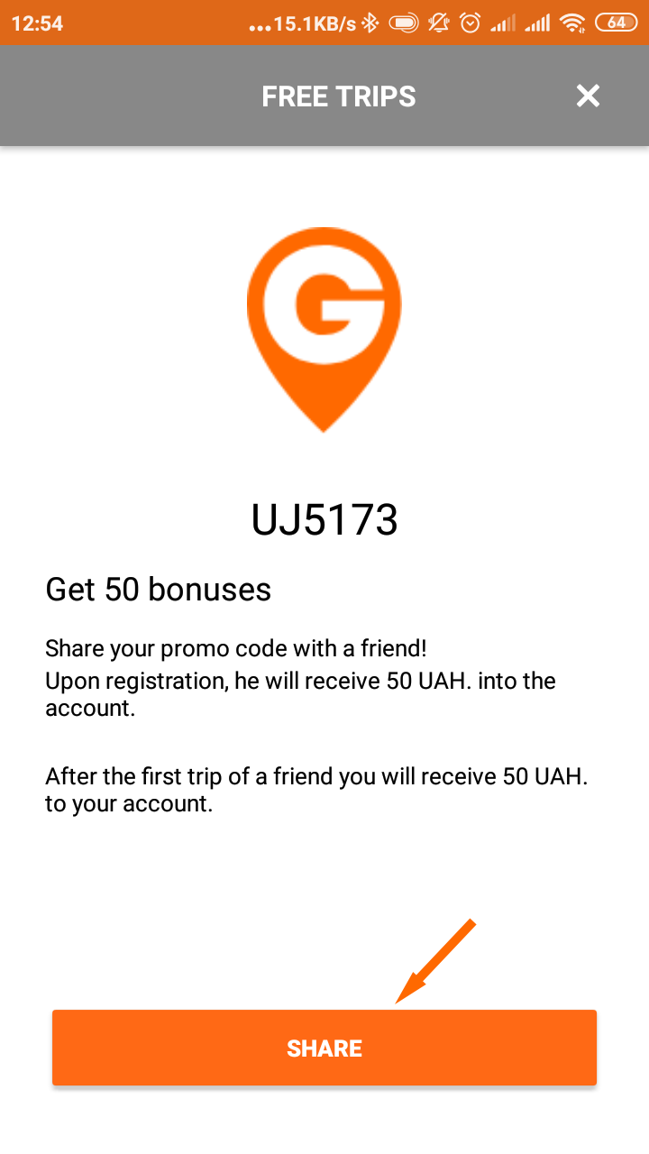 Give your friends 50 bonuses at the registration on your promo code. Send him a link on registration and just tell your friend a promo code. If your friend fills in the data of your promo code via registration, he will get 50 bonuses on the trips.