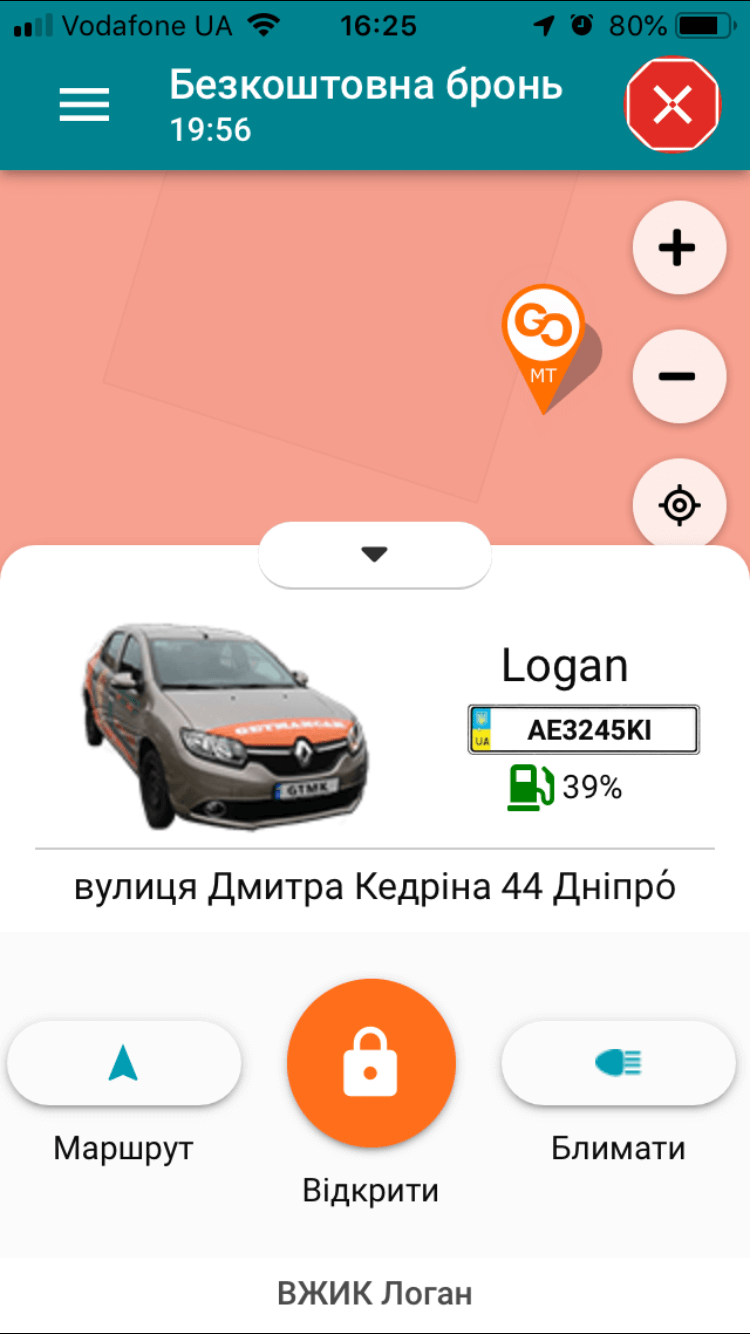 Теперь кнопка завершения находится вверху, кнопки открыть, маршрут к автомобилю и мигать внизу. Кнопка «завершение» представлена в виде знака. Так же и кнопка «передача».
